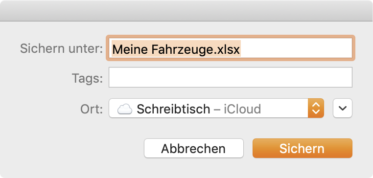 Die Daten von "Meine Fahrzeuge" können in eine Excel® XLSX Datei exportiert werden. Dabei werden nur die Daten ohne Anlagen und Bilder exportiert. Klicken Sie im Menü auf "Ablage" => "Export als XLSX Datei".