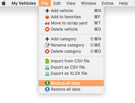 With the Backup feature you can make a backup of all data from «My Vehicles». Select "Backup all data" from the menu. Select a folder to create a backup. In this folder a new folder with the Name «My Vehicles» is created. In this folder the database and attachments are saved. |