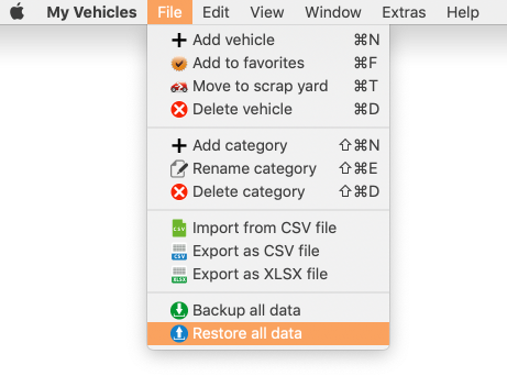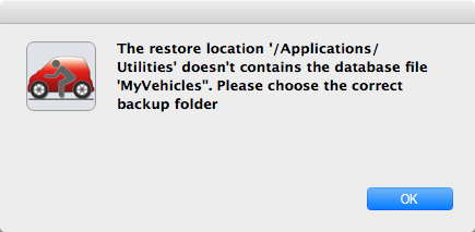 With the Restore feature you can restore the data (database and attachment folder). Select "Backup all data" from the menu. Select the backup folder where you have saved the data wit the backup feature. The database and the attachment folder are now restored. If the selected folder does not contains a valid backup of "My Vehicles", you see this message.